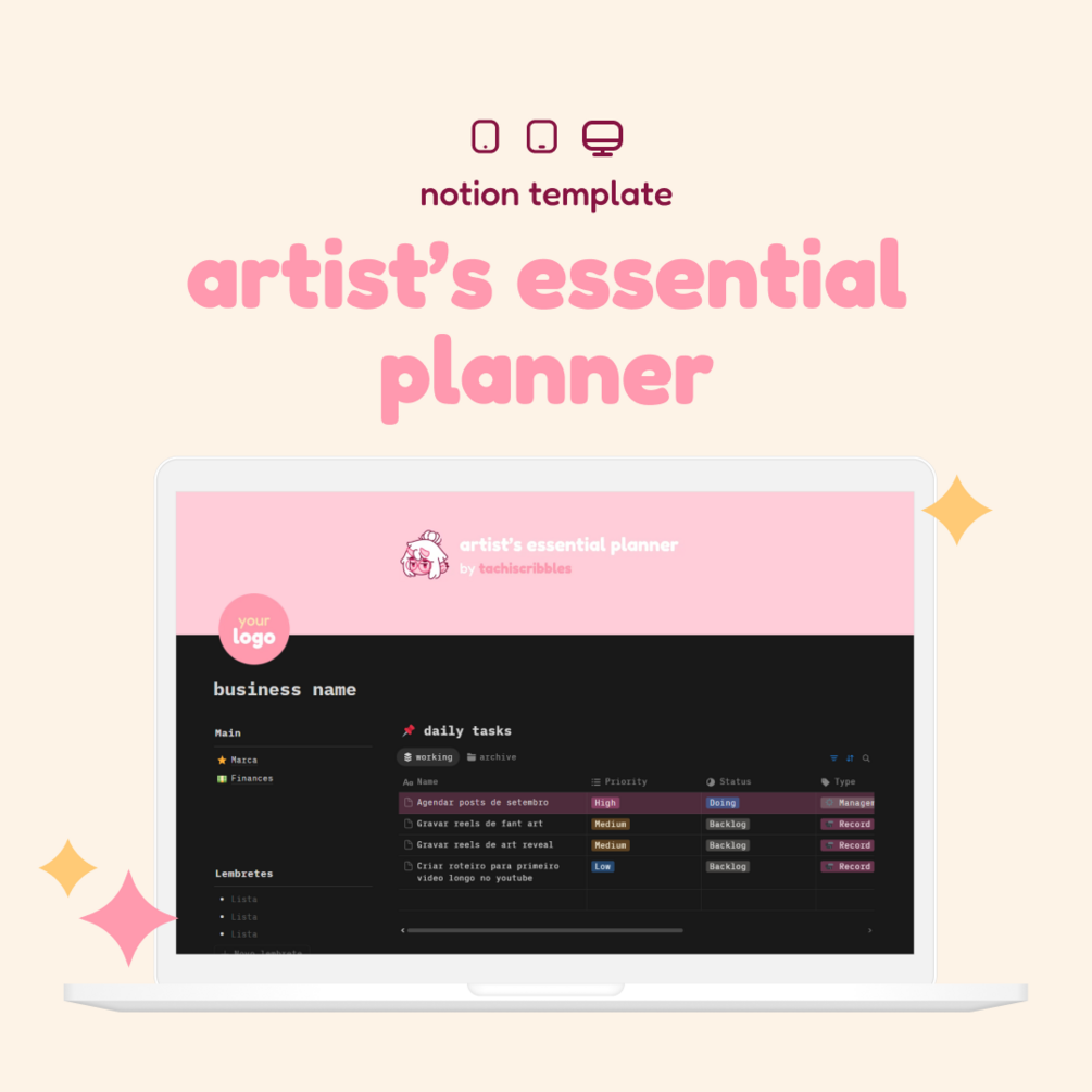 Boost your productivity and keep your art business on track with this all-in-one monthly template. Plan your social media posts, track your finances, and manage commissions effortlessly. Perfect for artists who want to focus on creating while staying organized. - Notion template